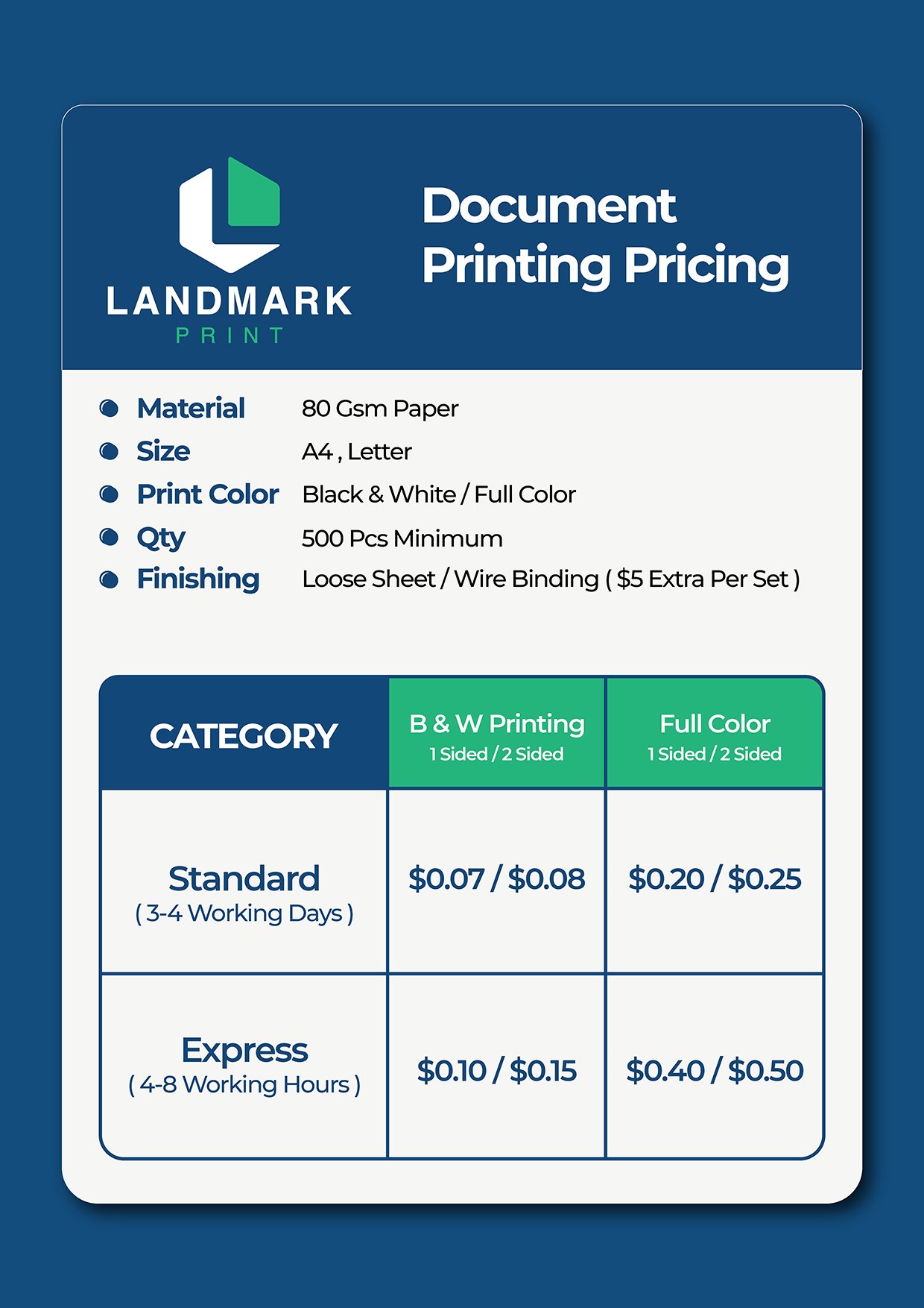 Get your documents printed with professional quality and affordable pricing. Perfect for reports, manuals, booklets, and presentations, our printing service ensures sharp text and vibrant colors on 80gsm premium paper. Available in both Standard (3-4 Working Days) and Express (4-8 Working Hours) turnaround times.
