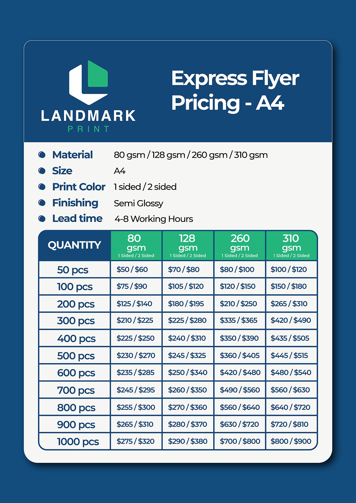 Make your promotions stand out with Express Flyer A4 printing from Landmark Print. With a balance of size, speed, and quality, these flyers are perfect for marketing campaigns, event promotions, and product launches.