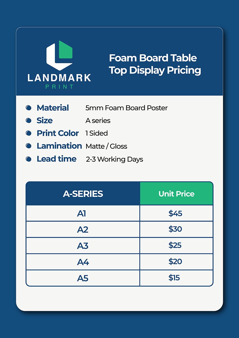 Showcase your content in style with our Foam Board Table Top Display, perfect for events, exhibitions, offices, retail displays, and décor. Made from durable 5mm foam board and paired with a sleek frame, these posters offer a premium, polished look.