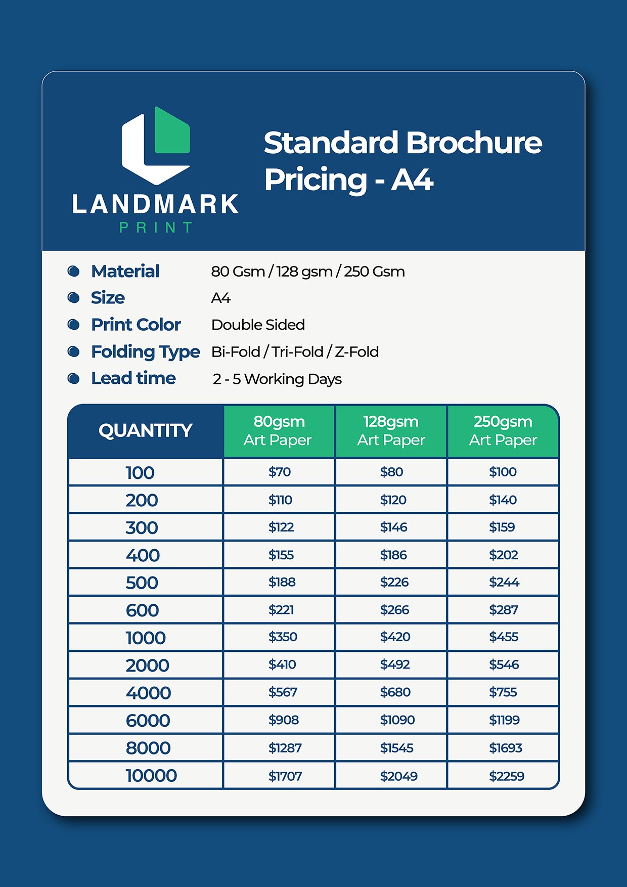 We offer brochures in 80gsm, 128gsm, and 250gsm art paper with double-sided full-color printing. Choose from Bi-Fold, Tri-Fold, or Z-Fold options to best suit your design and content.