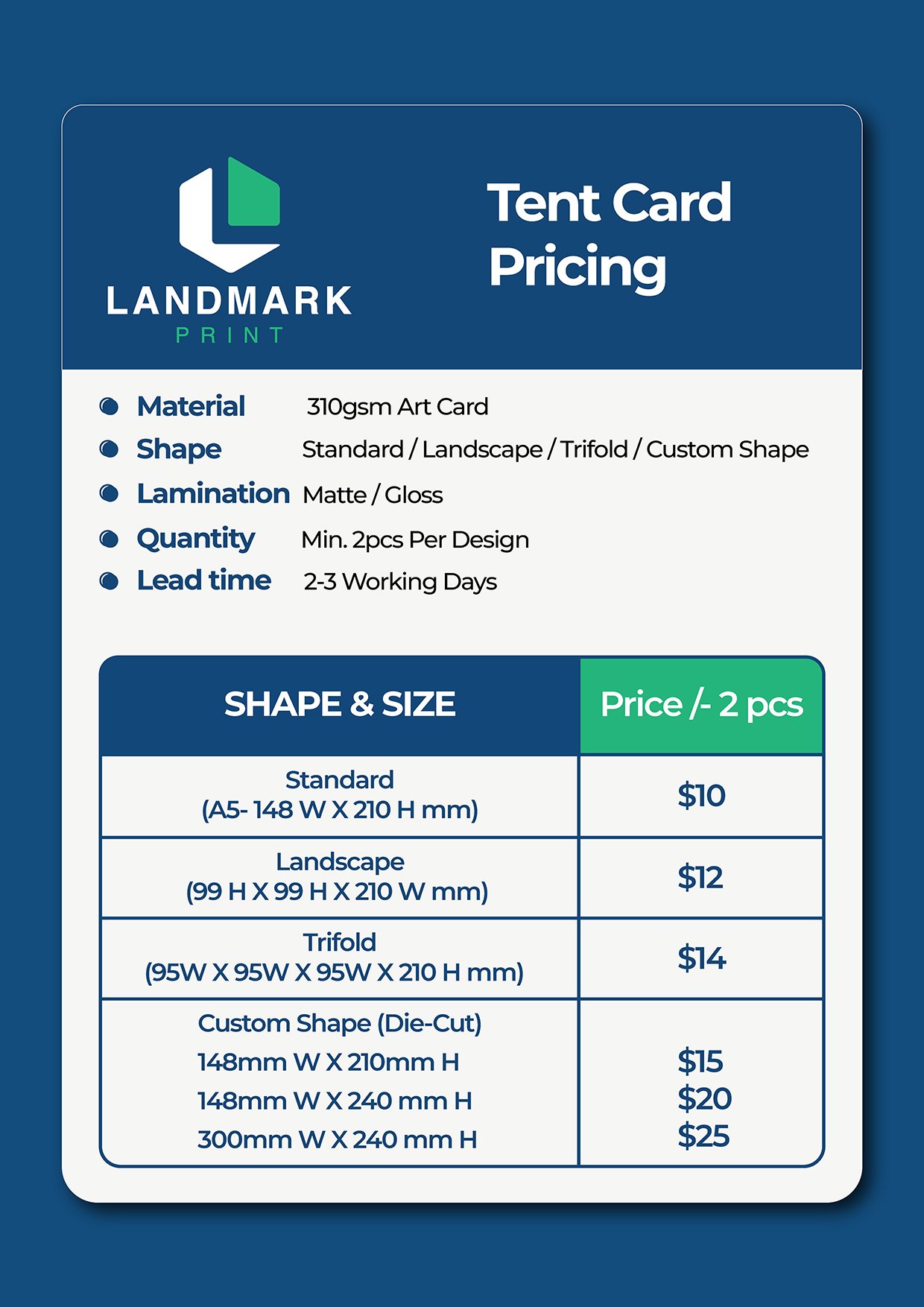 Make your brand stand out with our premium Tent Cards, perfect for restaurants, events, promotions, and corporate displays. Printed on 310gsm art card with your choice of Matte or Gloss lamination, these tent cards are designed for durability and a professional finish.